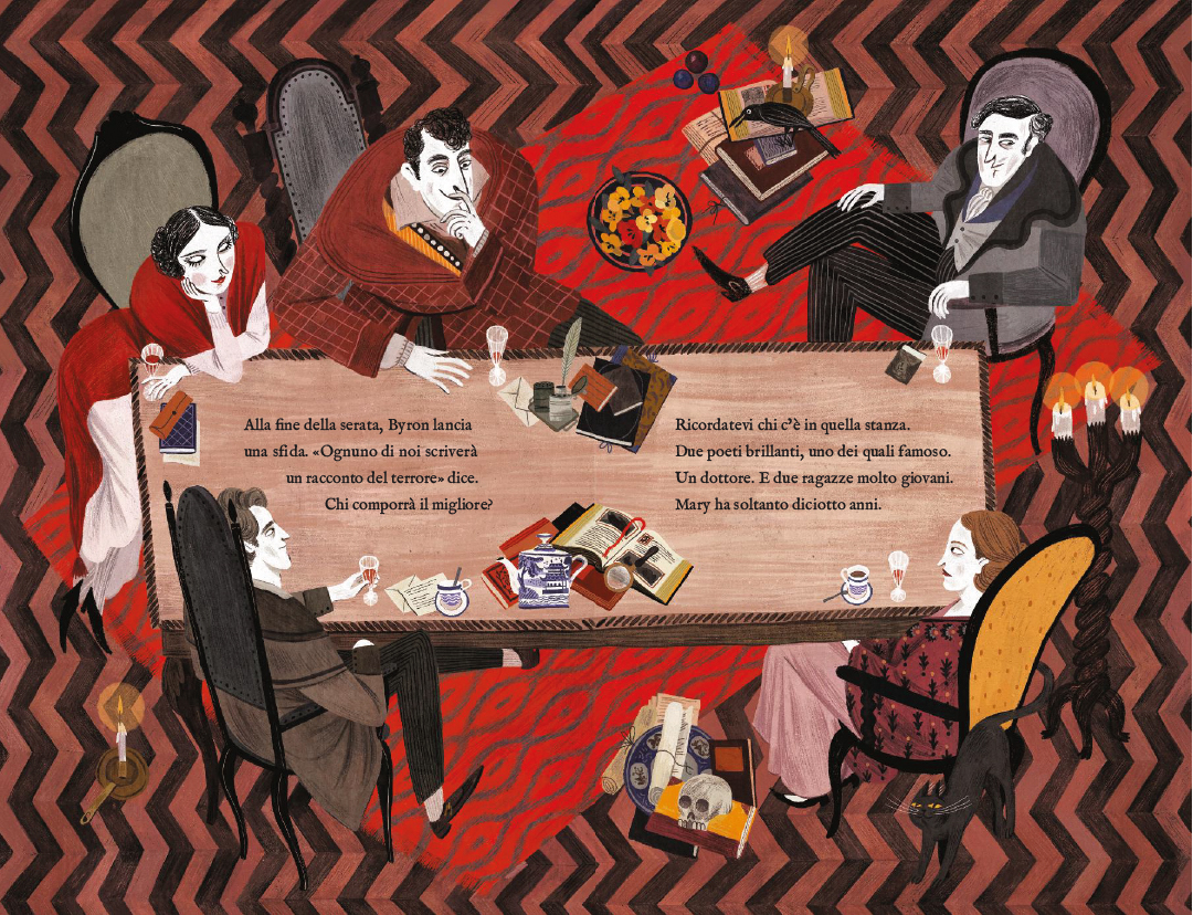 Júlia Sardà ha già al suo attivo una vasta bibliografia. Nonostante l’ancor giovane età ha realizzato libri vuoi come autrice completa, vuoi come illustratrice di testi altrui, vuoi infine cimentandosi con alcuni classici della letteratura per l’infanzia: da Alice nel paese delle meraviglie a Il Mago di Oz, da Charlie e la fabbrica di cioccolato a Mary Poppins, giunto nel nostro paese nel 2018 grazie a Rizzoli. Proprio da quest’ultimo editore vorrei partire giacché nel 2020 pubblicò un albo singolare che subito attrasse la mia attenzione: Mary la ragazza che creò Frankenstein scritto da Linda Bailey. Vi si narra della genesi di uno dei capolavori della letteratura gotica. Scritto da Mary Shelley (1797 – 1851) e pubblicato nel 1818 dopo una sorta di sfida lanciata due anni prima, durante una notte di tregenda, da lord Byron. Attorno al fuoco di Villa Diodati in Svizzera si ritrovarono infatti il medico John Polidori (che scrisse Il Vampiro), la sorellastra di Mary, Claire Clairmont, e Shelley. L’albo mi sembra riassumere alla perfezione le forti doti narrative dell’autrice. Capace di ricostruire con fervida precisione un mondo di passioni e di intrighi amorosi e non, di esaltazioni e fughe, di incubi e ossessioni, di ribellioni e sogni. Orbene, non è certo questa la sede per sottolineare la straordinaria e intramontabile fortuna transmediale dell’opera. A dettar legge sono le doppie tavole tutte diverse fra di loro per tagli prospettici, talvolta arditi, in un crescendo di interni claustrofobici, cieli cupi sferzati dal vento dove cavalcano creature diaboliche, pulsioni mortifere, piogge torrenziali. D’altro canto, a causa della spaventosa eruzione vulcanica del Tambora in Indonesia in quel remoto 1816 non vi fu praticamente estate. Un albo da assaporare con lentezza per scoprire via via la trama finissima del rapporto con il testo. Un rapporto fatto ora di accenni lievi ora di soprassalti fra macabro e calibrati tocchi di irrisione.