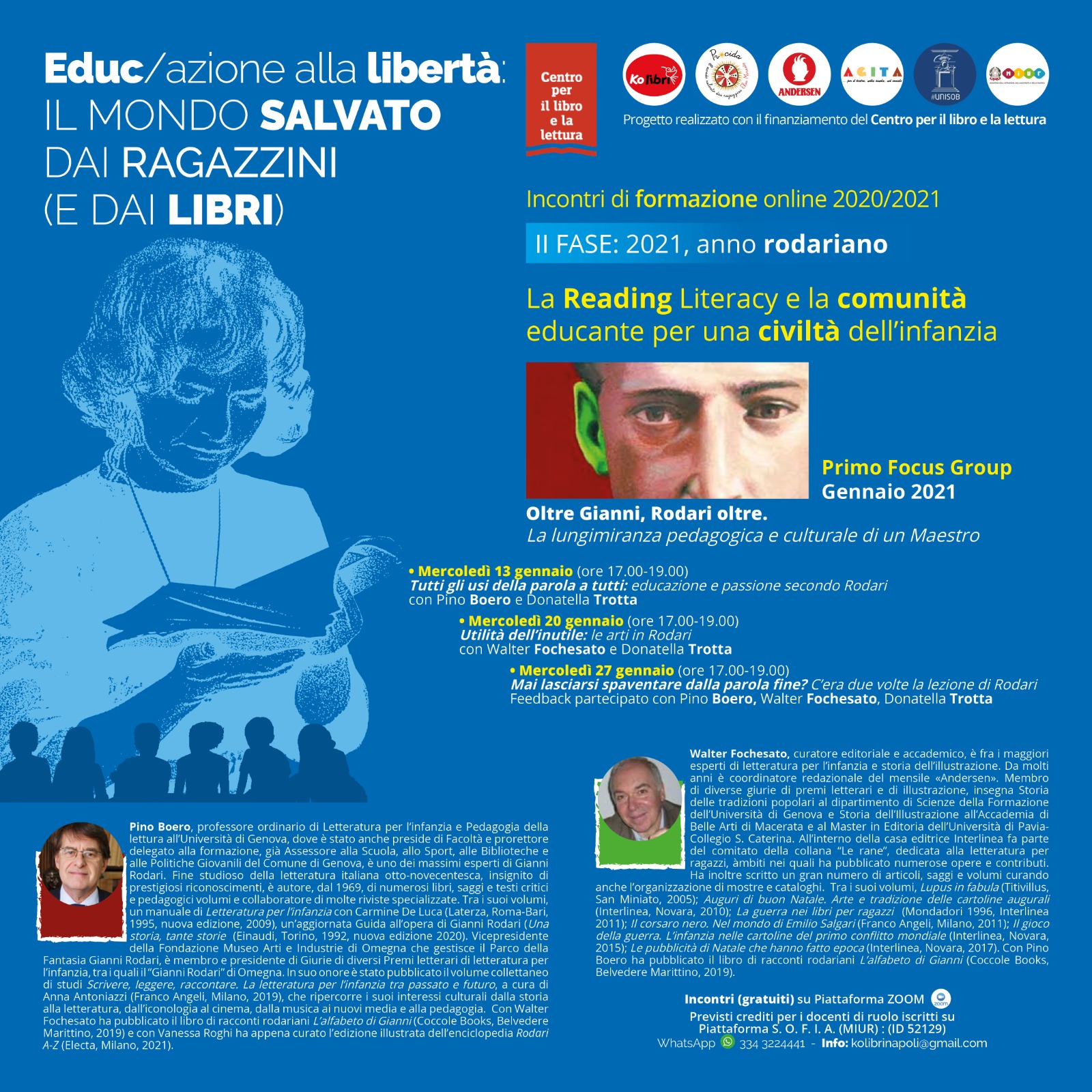 Mercoledì 13 gennaio – Il verbo leggere non sopporta l’imperativo: nasce da questa premessa rodariana il progetto Educ/azione alla libertà: Il mondo salvato dai ragazzini (e dai libri), che riprende oggi con un incontro online nel quale Pino Boero discuterà con Donatella Trotta di “educazione e passione” secondo il Maestro di Omegna. Il percorso formativo di quaranta ore, che si concluderà a giugno, è dedicato alla Reading Literacy per sensibilizzare i docenti (ma anche famiglie, educatori, bibliotecari, librai) sul valore cruciale dell’educazione precoce alla lettura, anche a voce alta.