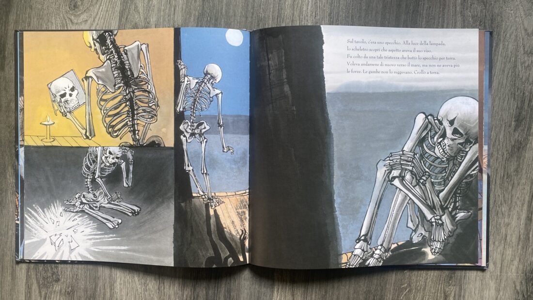 Il piccolo pescatore e lo scheletro di Chen Jing Hong (Camelozampa) – Tong, il piccolo pescatore, dopo la morte del padre vive da solo in una capanna in riva al mare. Un mare dove si avventura in cerca di cibo e dove si trova faccia a faccia con un grosso scheletro: una presenza minacciosa o al contrario protettiva e rassicurante? Il piccolo Tong, nonostante l’inquietudine, sceglie di mostrarsi ospitale… Un albo illustrato di grande intensità emotiva, che scuote, spaventa e incanta il suo lettore.